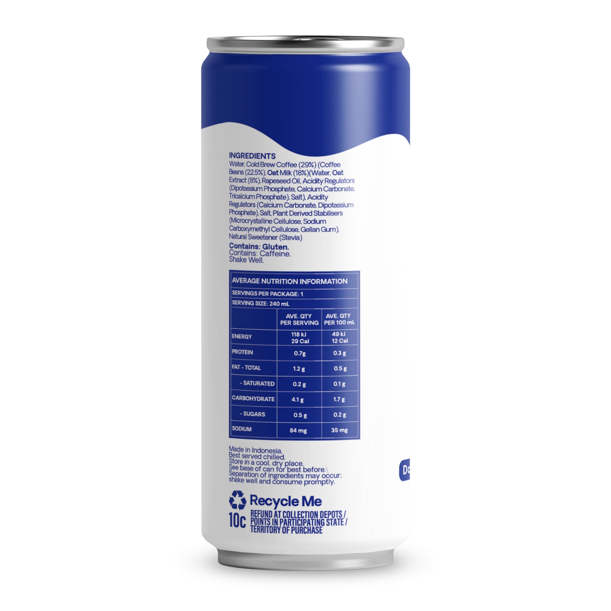 Contains: gluten. Contains: caffeine. Halal + Vegan friendly. 240 mL cans.